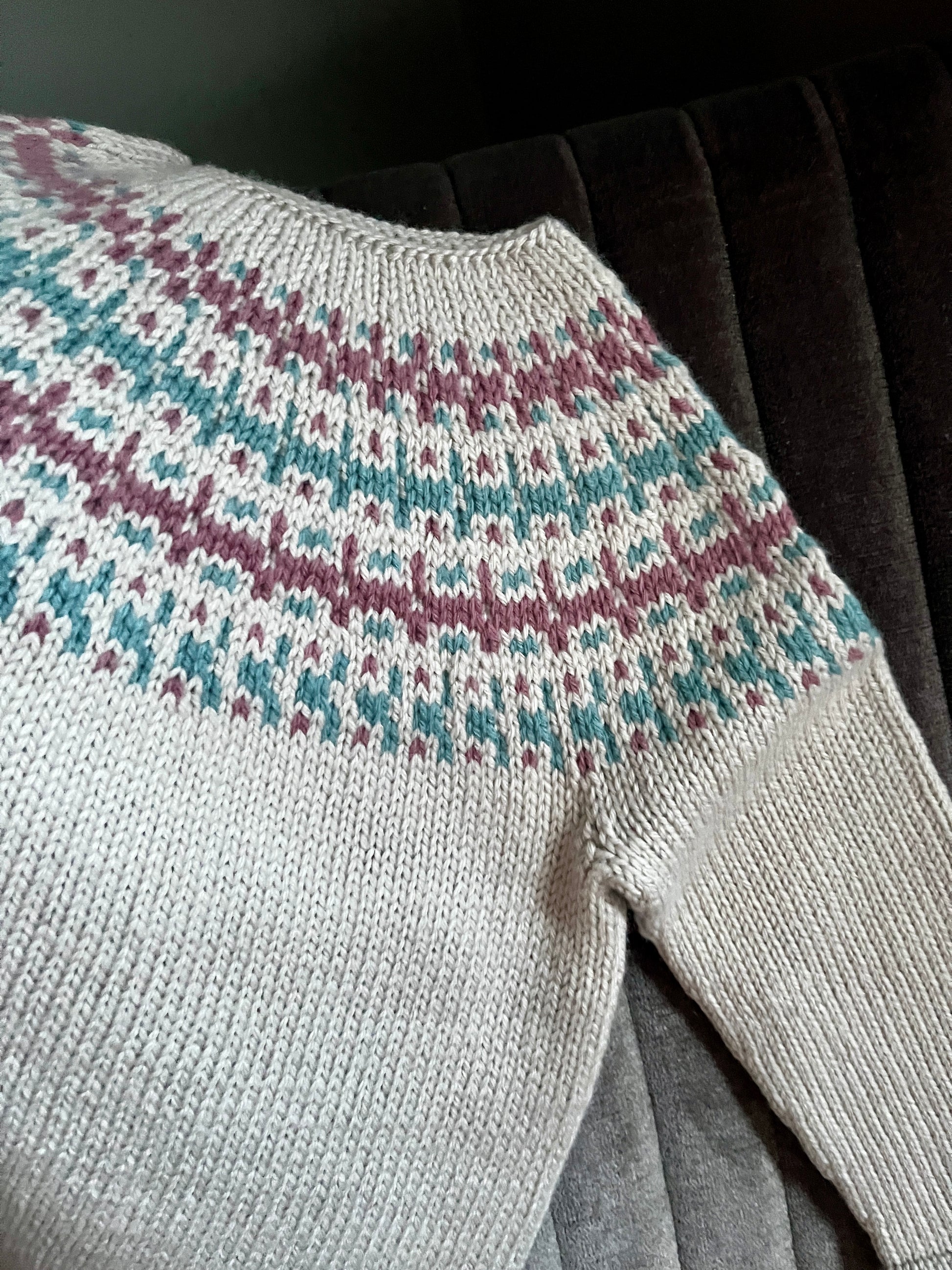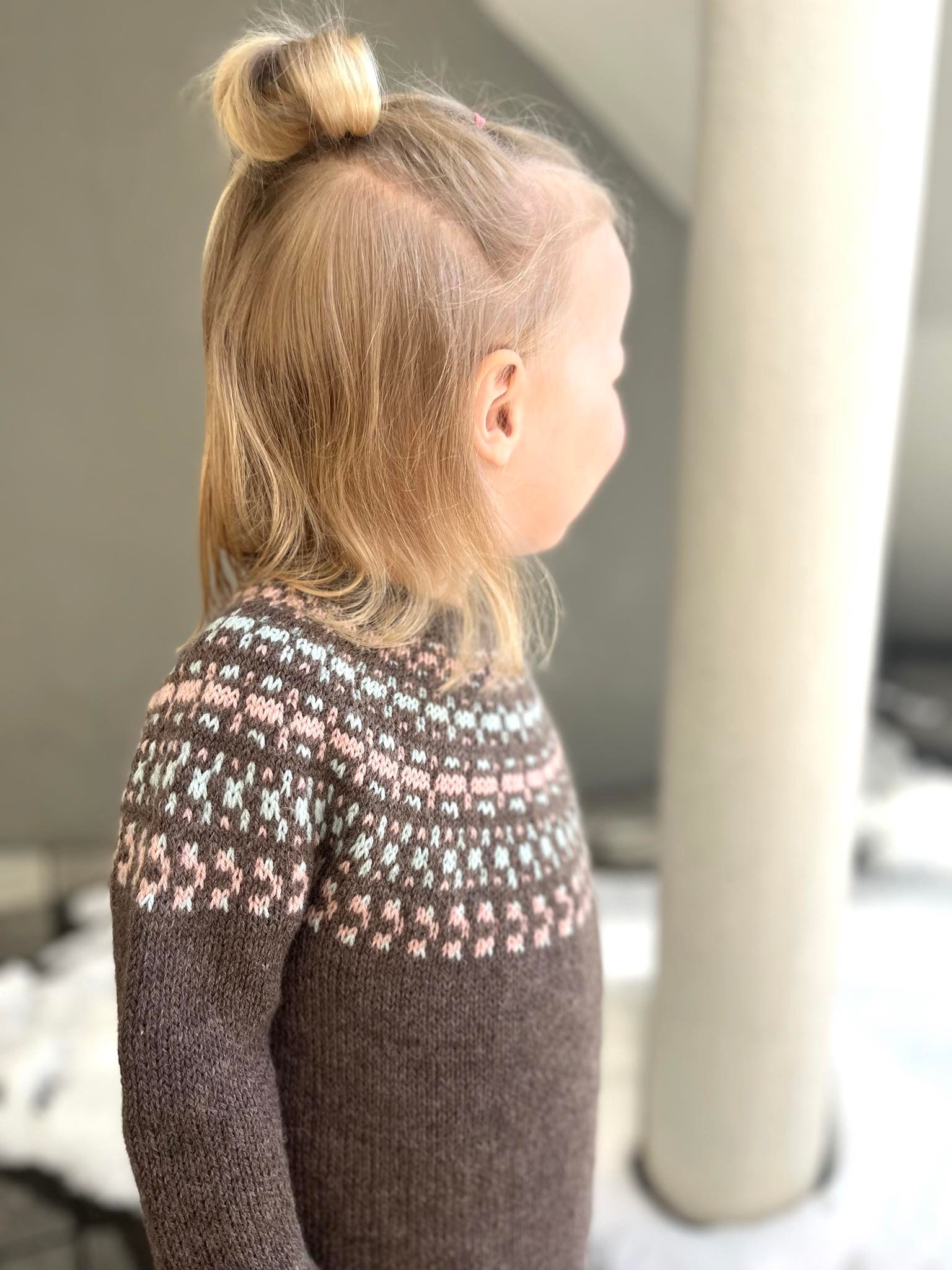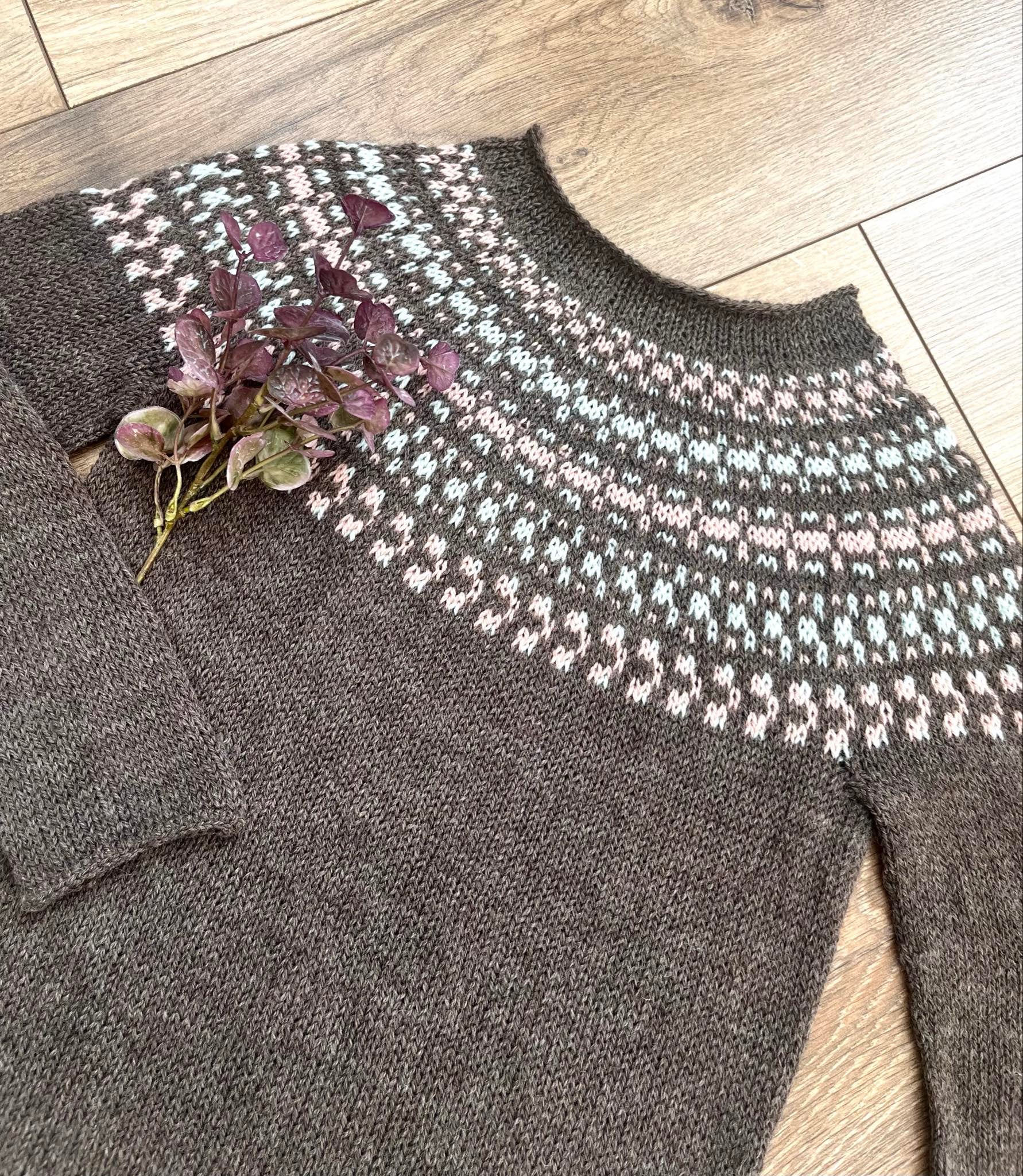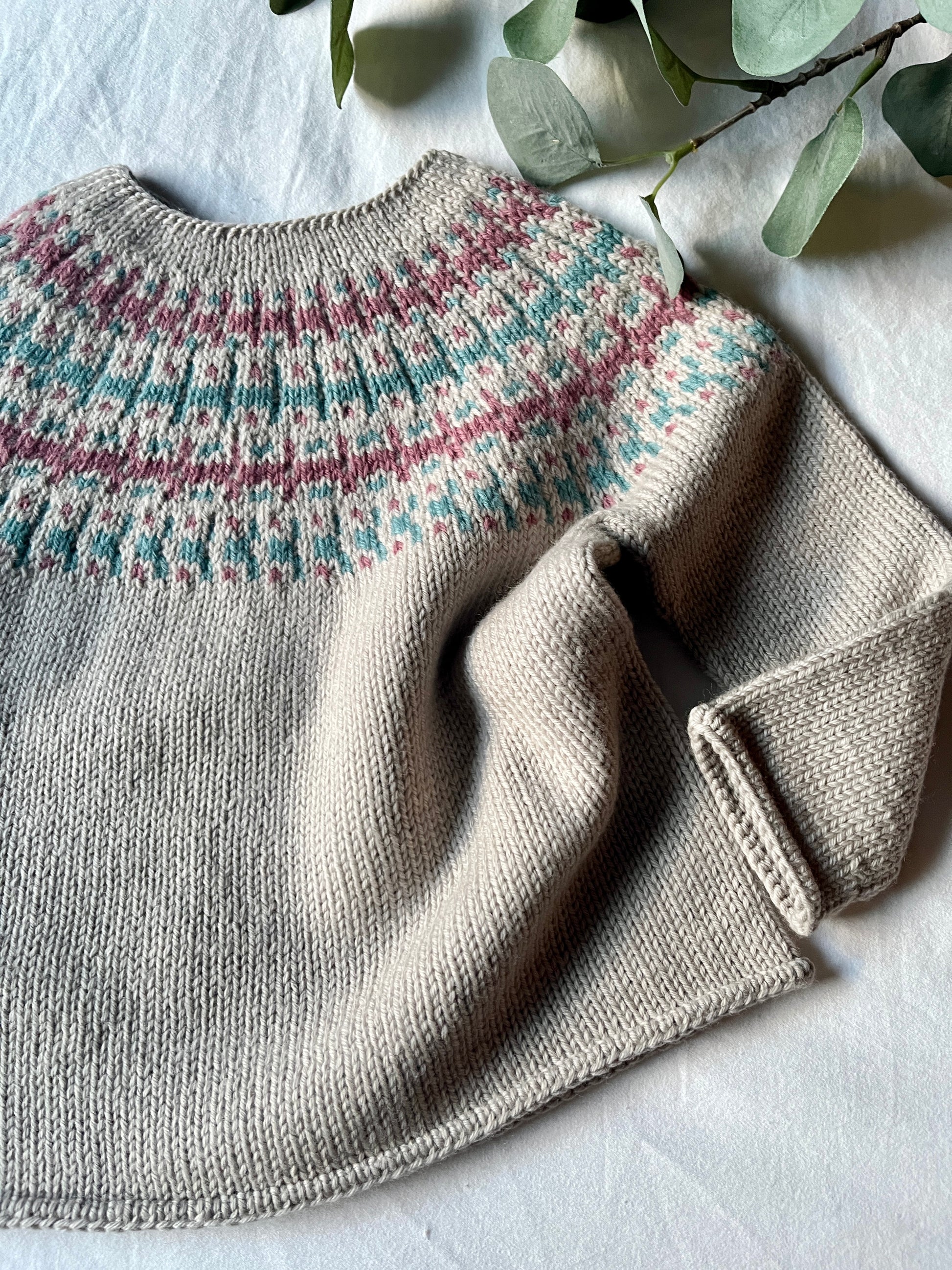 Stundum verða uppskriftirnar mínar til, nánast upp úr þurru. Þessi peysa er akkúrat þannig – ég var að leika mér að teikna upp mynstur og hugmyndinni laust niður. Peysan er prjónuð ofan frá og niður, í hring með útaukningum og mynstri á berustykki. Öðruvísi frágangur á ermum og bol en vanaleg stroff. Hálsmál er heldur ekki með vanalegu stroffi og er prjónað slétt og mun rúllast aðeins. Ég mæli með að lesa yfir uppskriftina í heild áður en þú byrjar.