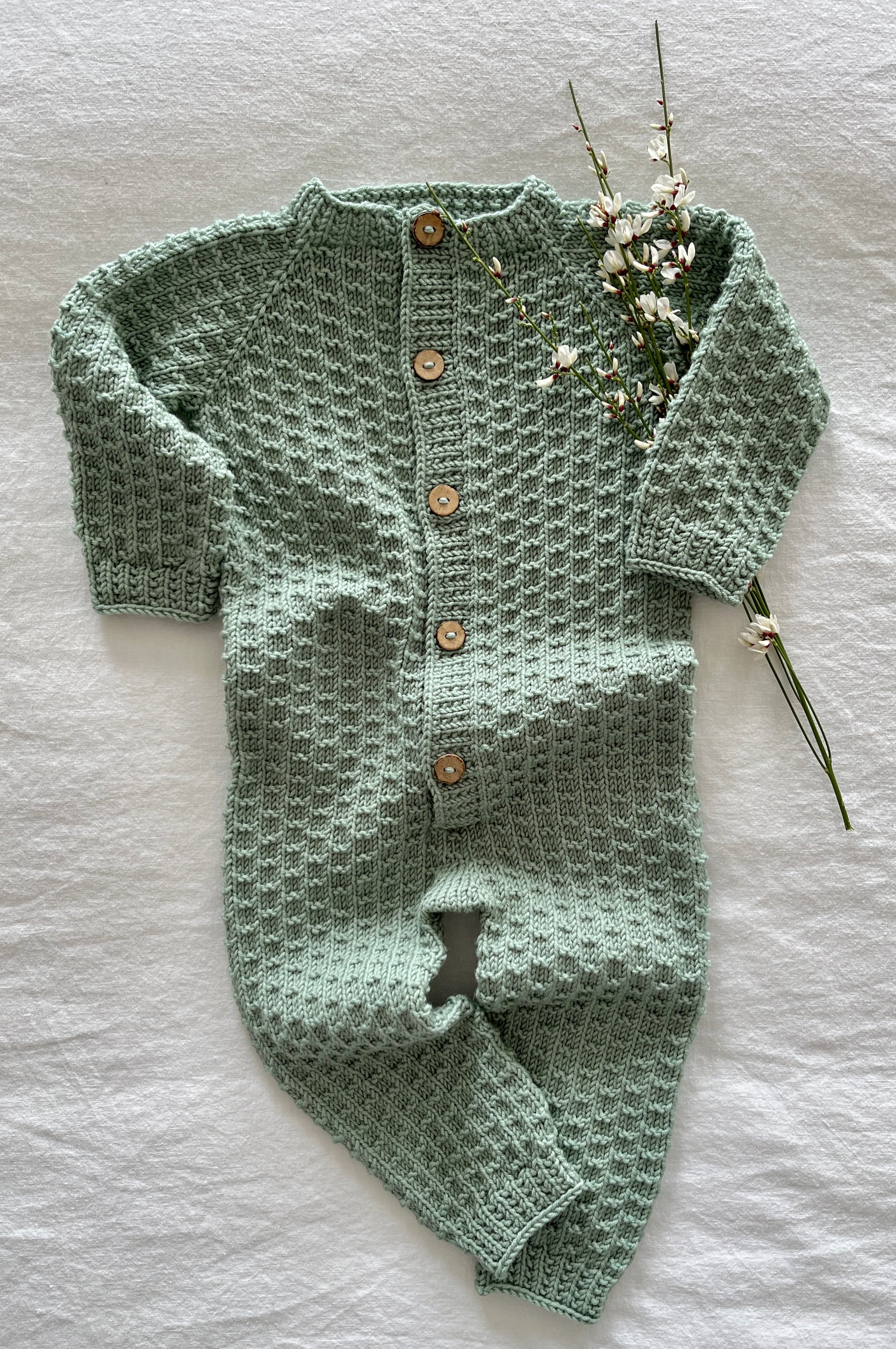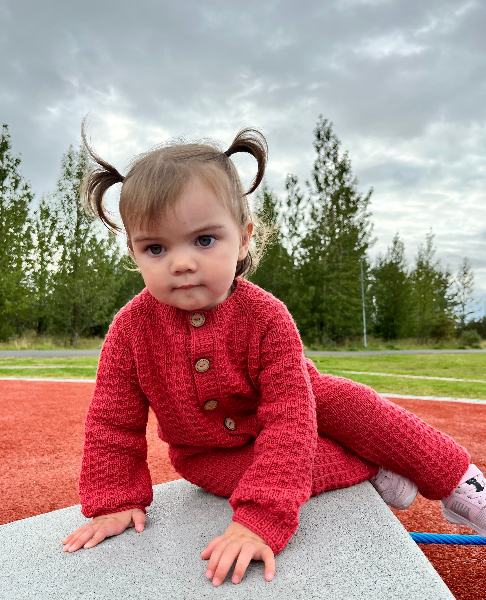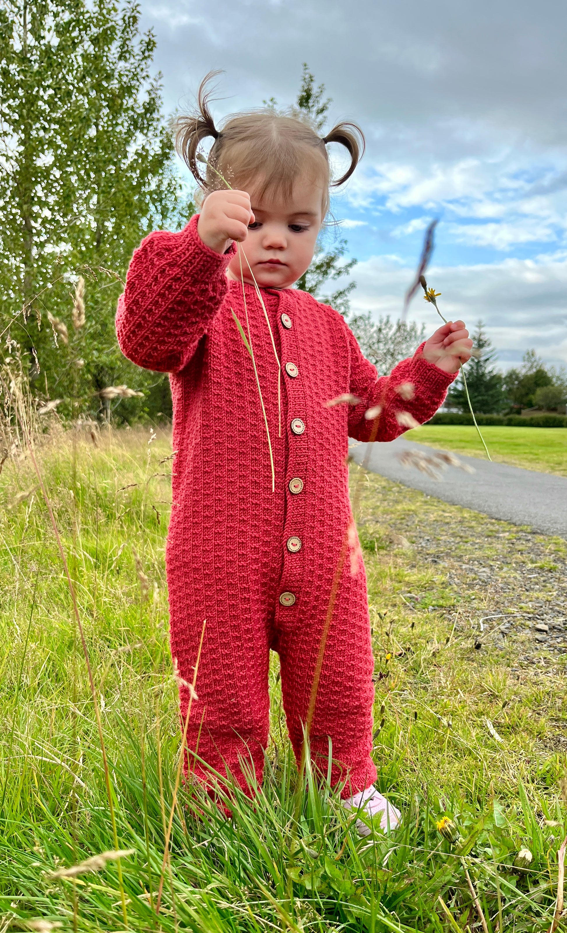 Í vetur sem leið (2021 – 2022) bað vinkona mín mig um að prjóna galla sem heimferðarföt fyrir væntanlegt barnabarn. Ég prjónaði fyrir hana galla og skrifaði um leið niður hjá mér uppskrift af honum sem síðan hefur velkst um í huganum á mér og tekið ýmsum breytingum en hér er lokaútkoman af þeirri vinnu. Gallinn er prjónaður frá hálsmáli og niður, fram og til baka niður eftir bol en síðan er tengt í hring. Hann er með laskaútaukningum og mynstri alla leið niður og einnig á ermum. Mynstrið, sem kallast tvöfalt Andalúsíuprjón, samanstendur aðeins af sléttum og brugðum lykkjum. Mynstrið sem er frekar einfalt er síendurtekið og myndar skemmtilega heild. Ég mæli með að lesa uppskriftina yfir áður en þið byrjið.