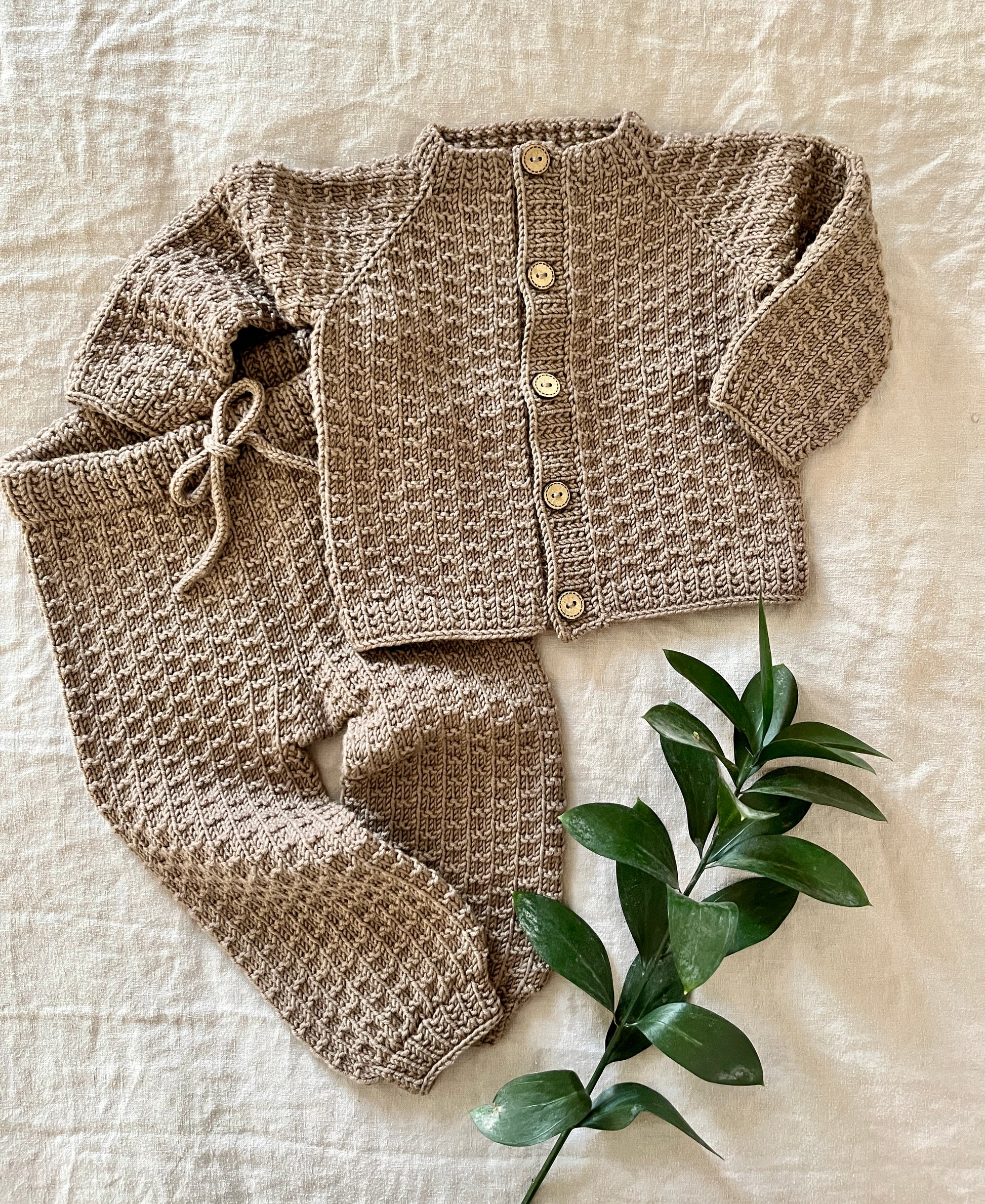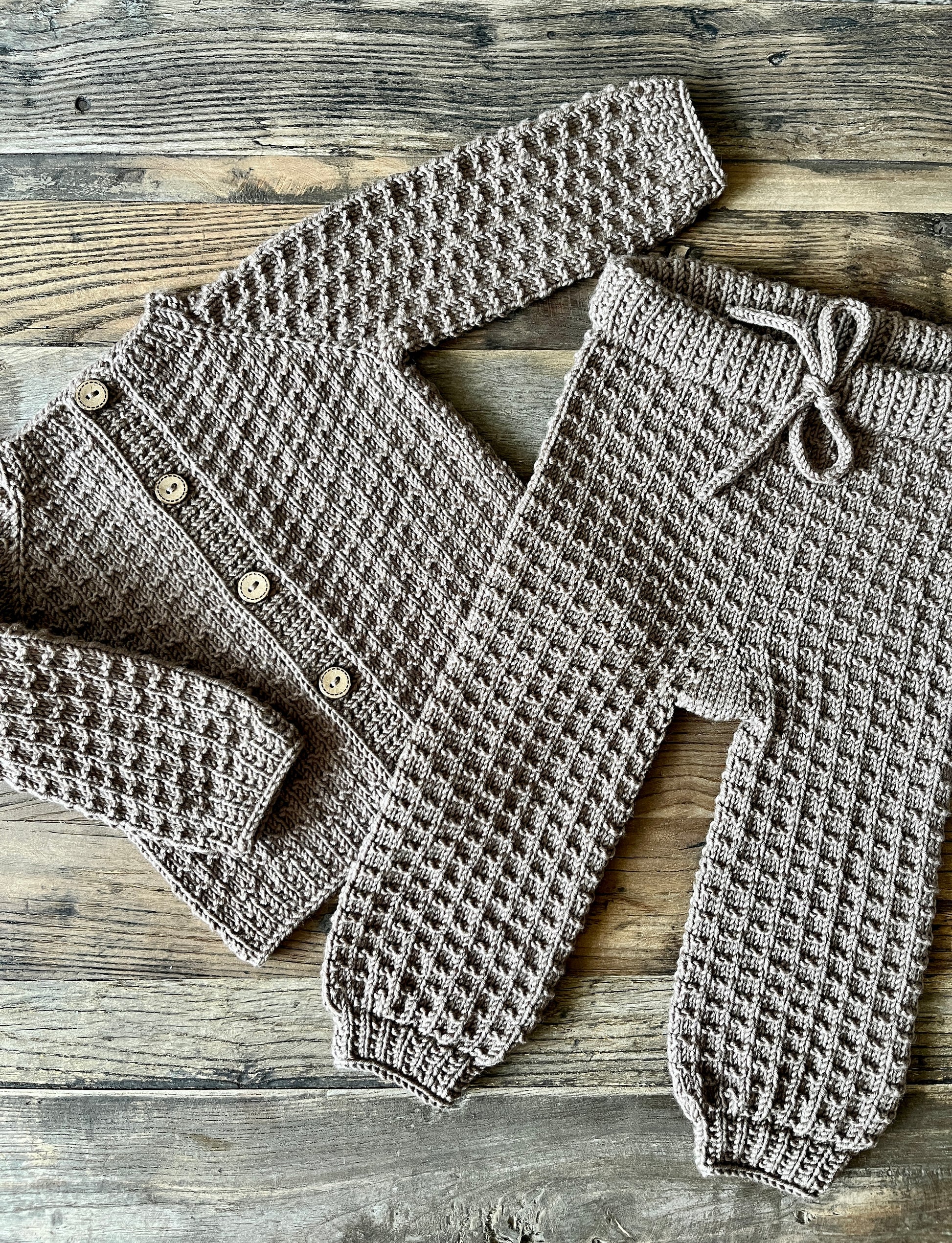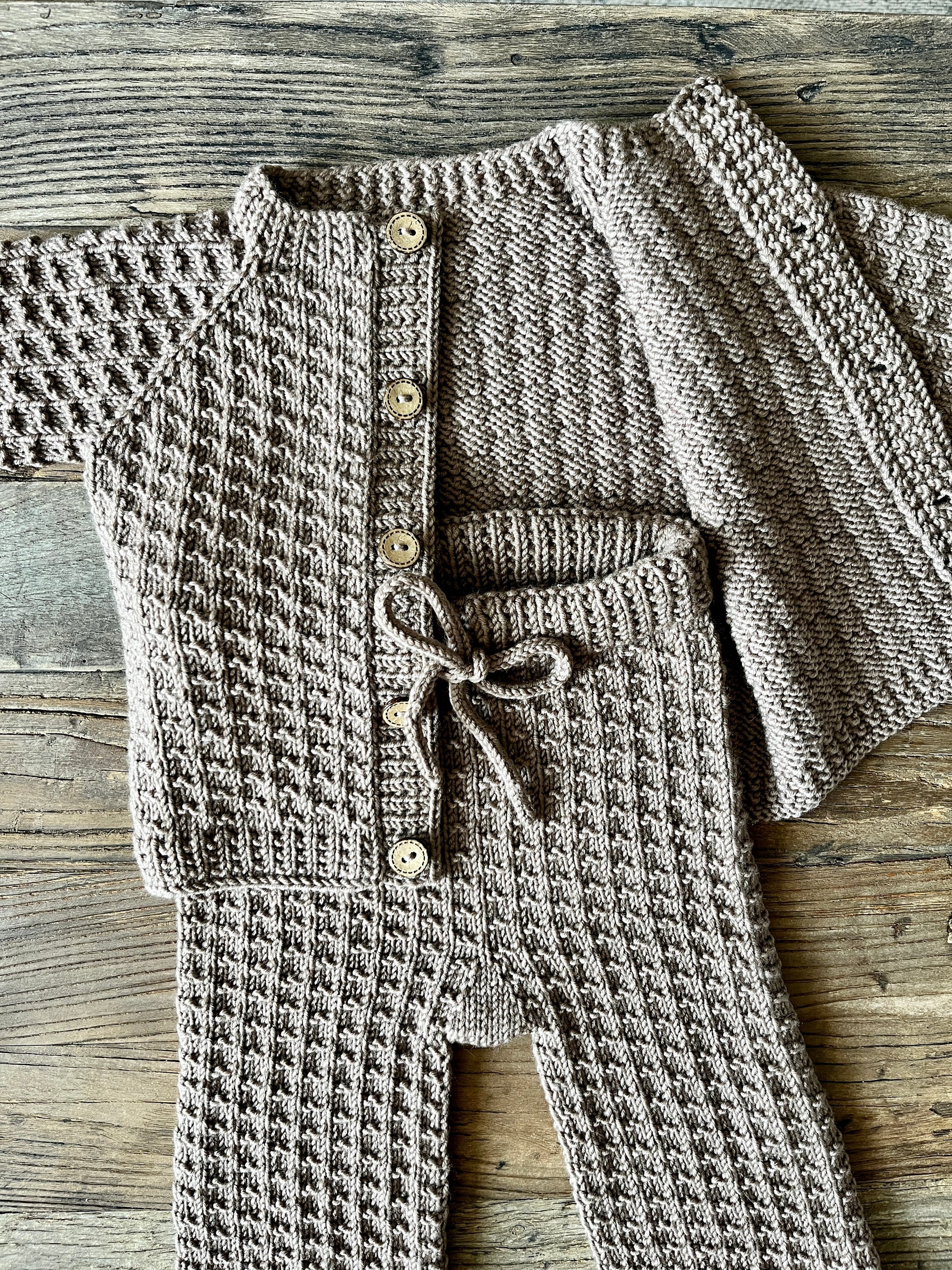 Lerki peysan og buxurnar eru hluti af Lerki línunni sem byrjaði með einum heilgalla, þegar vinkona mín bað mig um að prjónaheimferðarsett fyrir komandi ömmubarn. Síðan urðu peysan, buxurnar og húfurnar til. Mynstrið, sem kallast tvöfalt Andalúsíuprjón, samanstendur aðeins af sléttum og brugðum lykkjum. Það er frekar einfalt, er síendurtekið og myndar þannig skemmtilega heild. Ég mæli með að lesa hvora uppskrift fyrir sig yfir áður en þið byrjið.