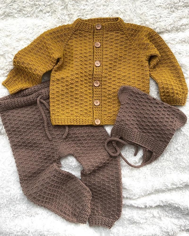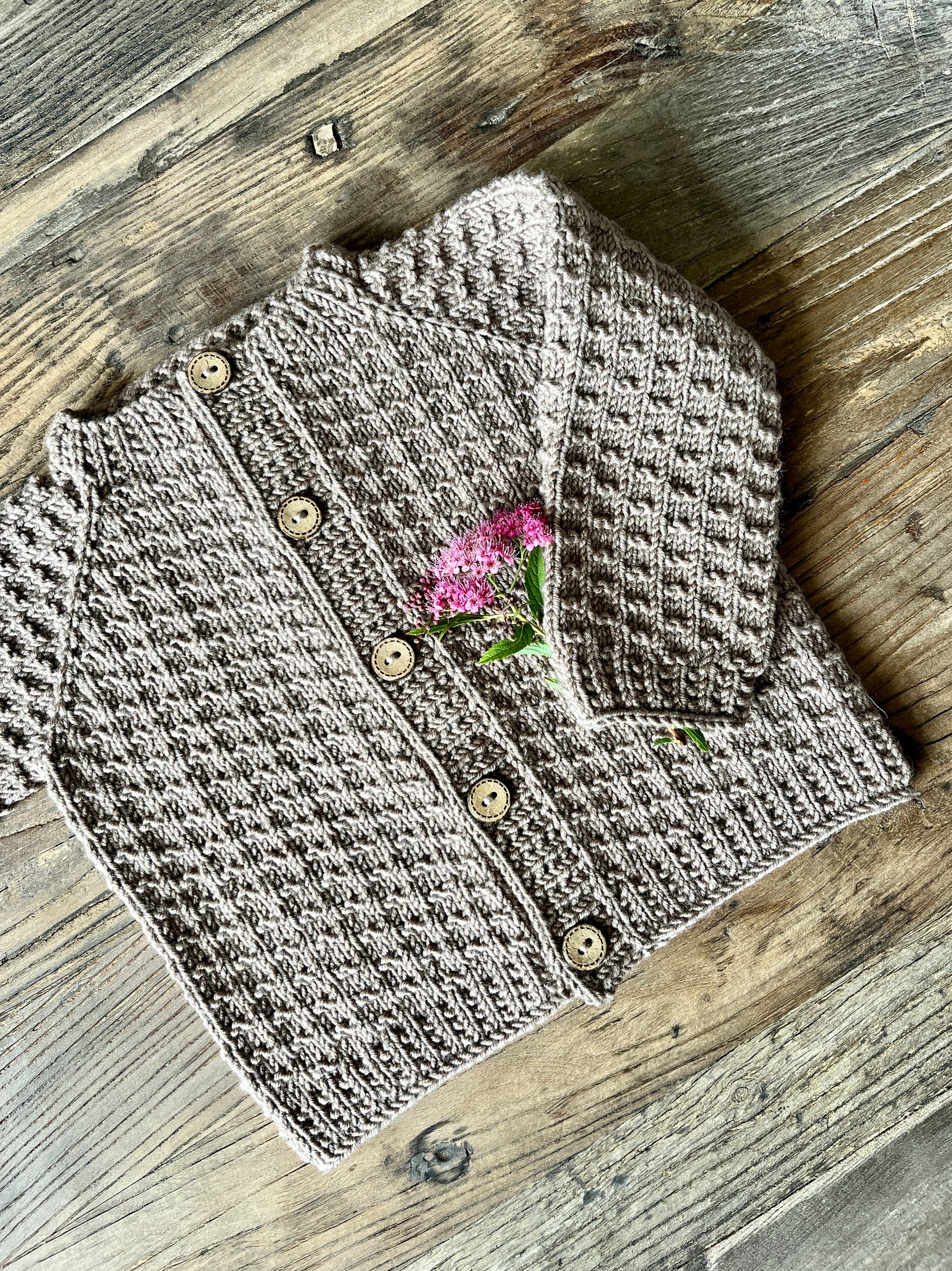 Lerki settið, peysa, buxur og húfa er hluti af Lerki línunni sem byrjaði með einum heilgalla, þegar vinkona mín bað mig um að prjónaheimferðarsett fyrir komandi ömmubarn. Síðan urðu peysan, buxurnar og húfurnar til. Mynstrið á settinu, sem kallast tvöfalt Andalúsíuprjón, samanstendur aðeins af sléttum og brugðum lykkjum. Það er frekar einfalt, er síendurtekið og myndar þannig skemmtilega heild. Ég mæli með að lesa hverja uppskrift fyrir sig yfir áður en þið byrjið.