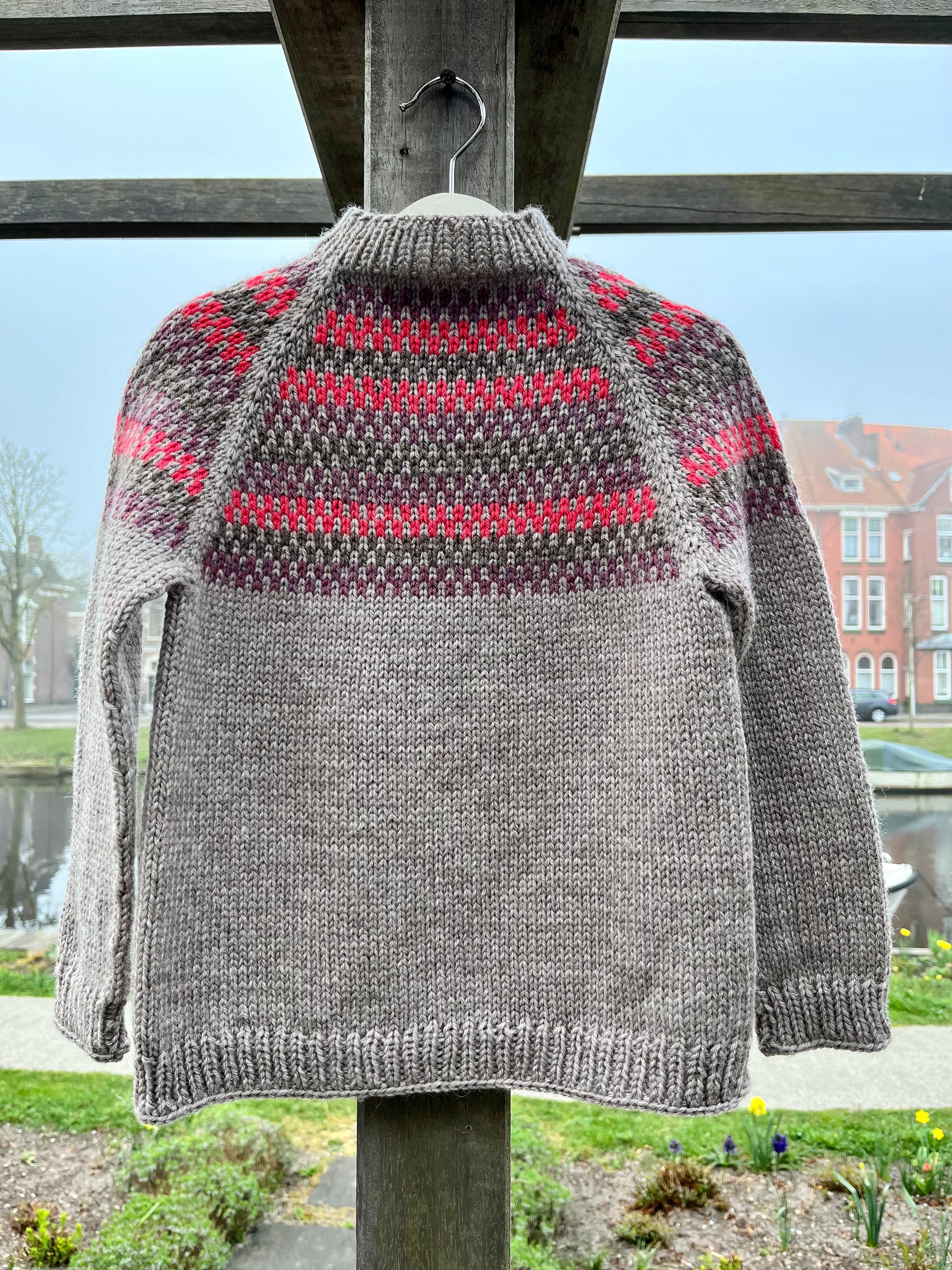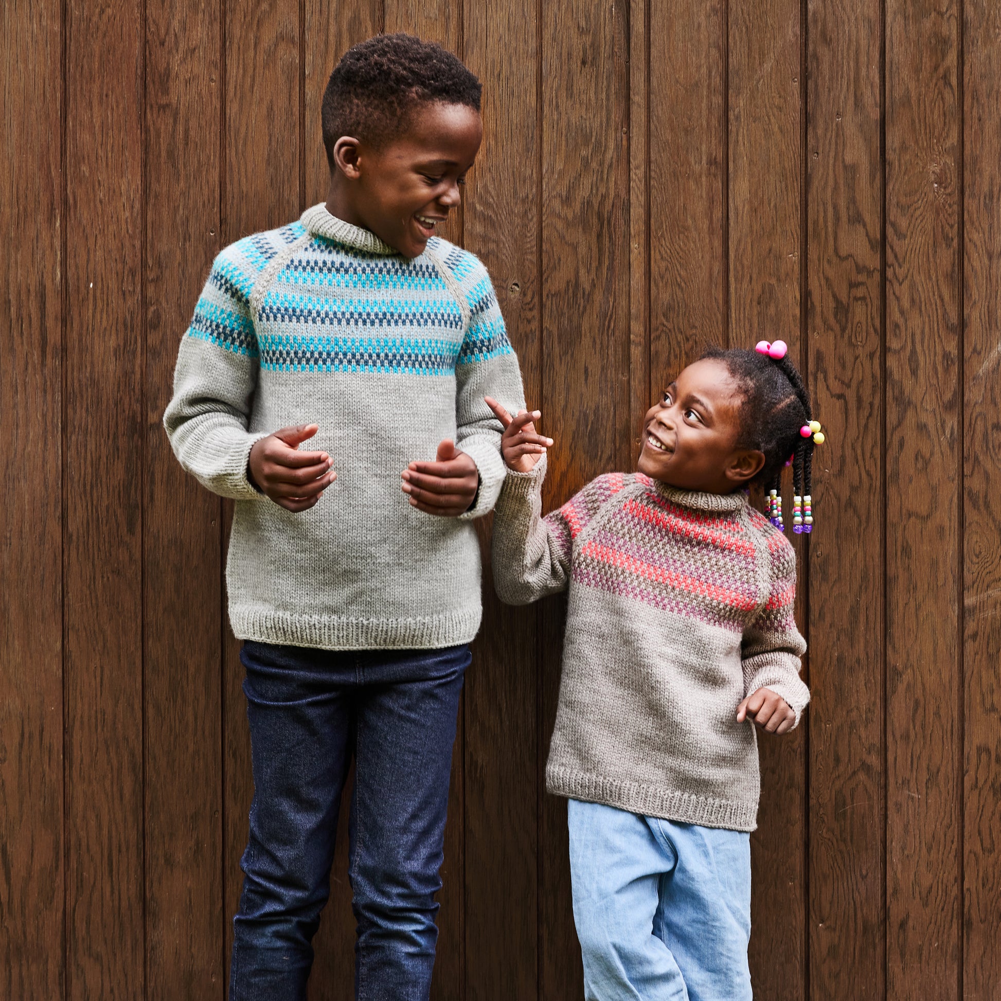 Stundum vefja hugmyndir upp á sig. Það sem var í fyrstu hugmynd af dömupeysu (Lyng no.1) þróaðist út í barnapeysuna Lyng no. 2, sem er með sama mynstrinu, og nú geta mömmur og börn verið í stíl. Hver veit nema það verði svo eitthvað fleira. Peysan er prjónuð ofan frá og niður, með laskaútaukningu og mynstri á berustykki sem er samsett úr einföldum endurtekningum og aðeins eru notaðir tveir litir í einu. Ég mæli með að lesa uppskriftina yfir áður en þú byrjar.