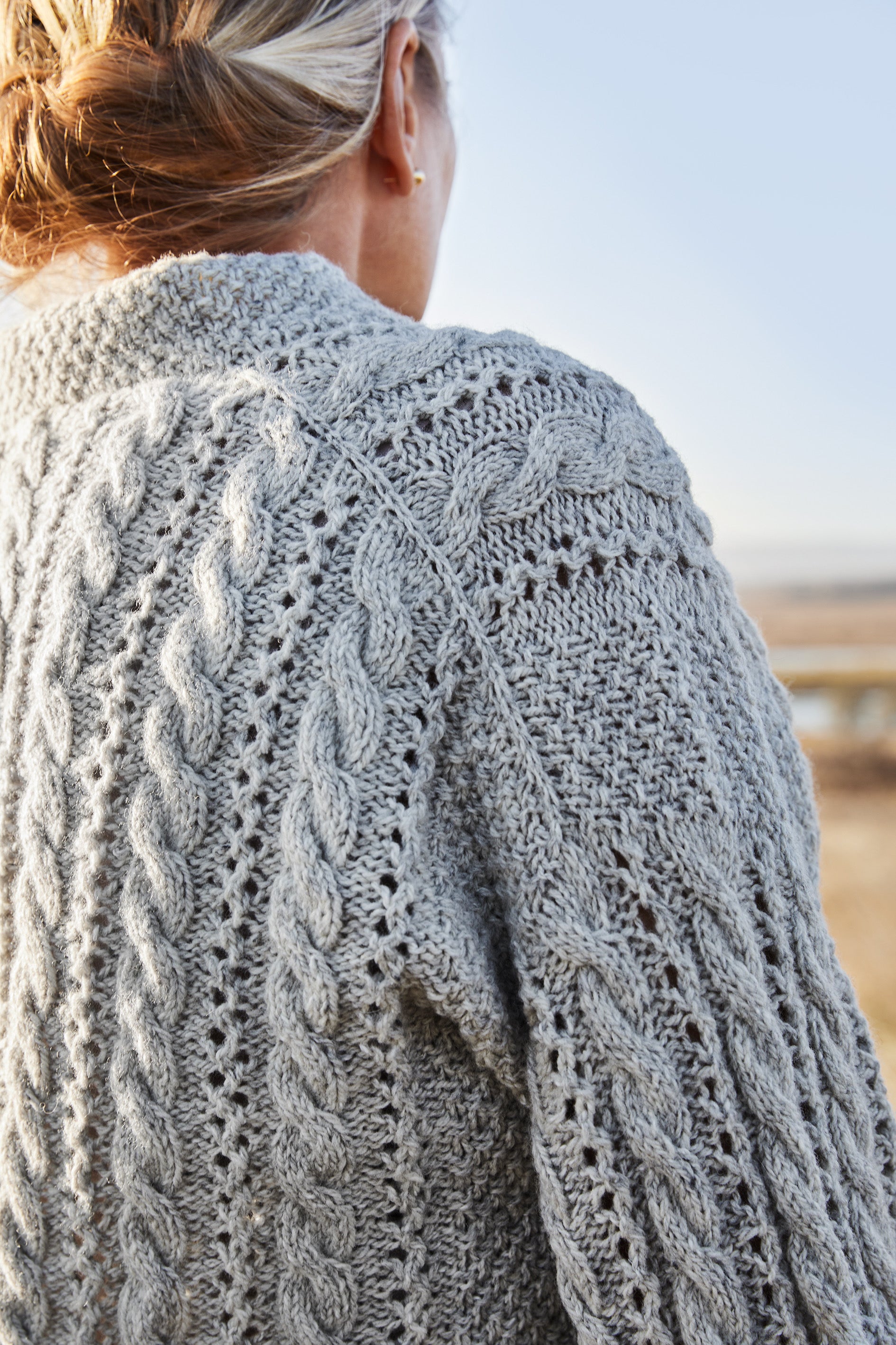 Ég er lengi búin að vera með þá hugmynd í kollinum að gera fullorðins peysu með kaðlaprjóni. Út frá þeirri hugmynd spruttu svo aðrar flíkur og teppið í Nóvember línunni sem nú þegar eru komnar uppskriftir að. Ég réðist svo loksins í að gera fullorðins peysuna og er svo sannarlega ánægð með hana. Peysan er prjónuð ofan frá og niður með köðlum, fallegu gatamynstri ásamt perluprjóni. Hún er prjónuð með svokallaðri evrópskri öxl þar sem bakstykki er prjónað fyrst fram og til baka, síðan axlarstykkin og að lokum allt tengt saman í hring. Ermar eru prjónaðar með kaðla – og gatamynstri. Hár kragi prjónaður með perluprjóni. Ég mæli með að lesa yfir uppskriftina í heild áður en þú byrjar.