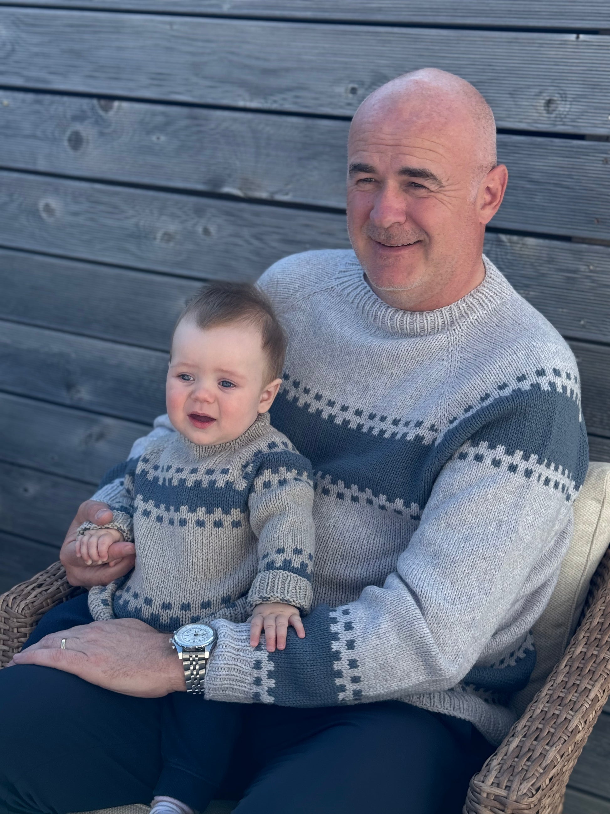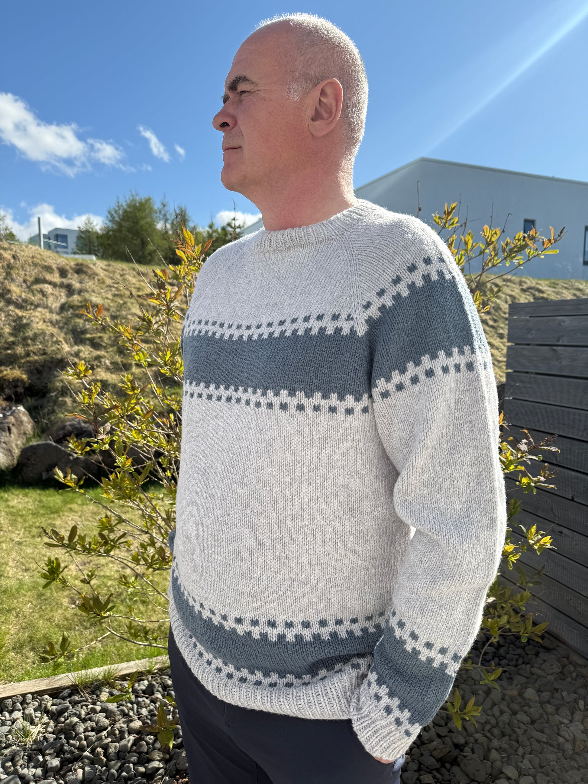 Hér kemur fullorðins útgáfan af peysunni hans Steina. Peysunni sem á svo skemmtilega sögu því í fyrrasumar (2024) áskotnuðust manninum mínum svo dásamlegar, gamlar myndir. Þær voru flestar af honum og þar á meðal var ein, sennilega tekin sumarið 1974 þegar hann var tveggja ára og hann er á myndinni í svo fallegri heimaprjónaðri peysu sem prjónuð var af fingrum fram af mömmu hans. Ég fékk strax hugmynd að endurgera og nútímavæða þessa barnapeysu með nýrri uppskrift, nefna hana peysuna hans Steina í höfuðið á honum og svo að búa líka til fullorðins útgáfu þannig að allir geti notið þess að vera í peysunni hans Steina. Peysan er prjónuð ofan frá og niður, í hring með laskaútaukningu. Einfalt mynstur á berustykki, neðst á bol og ermum. Ég mæli með að lesa yfir uppskriftina í heild áður en þú byrjar.