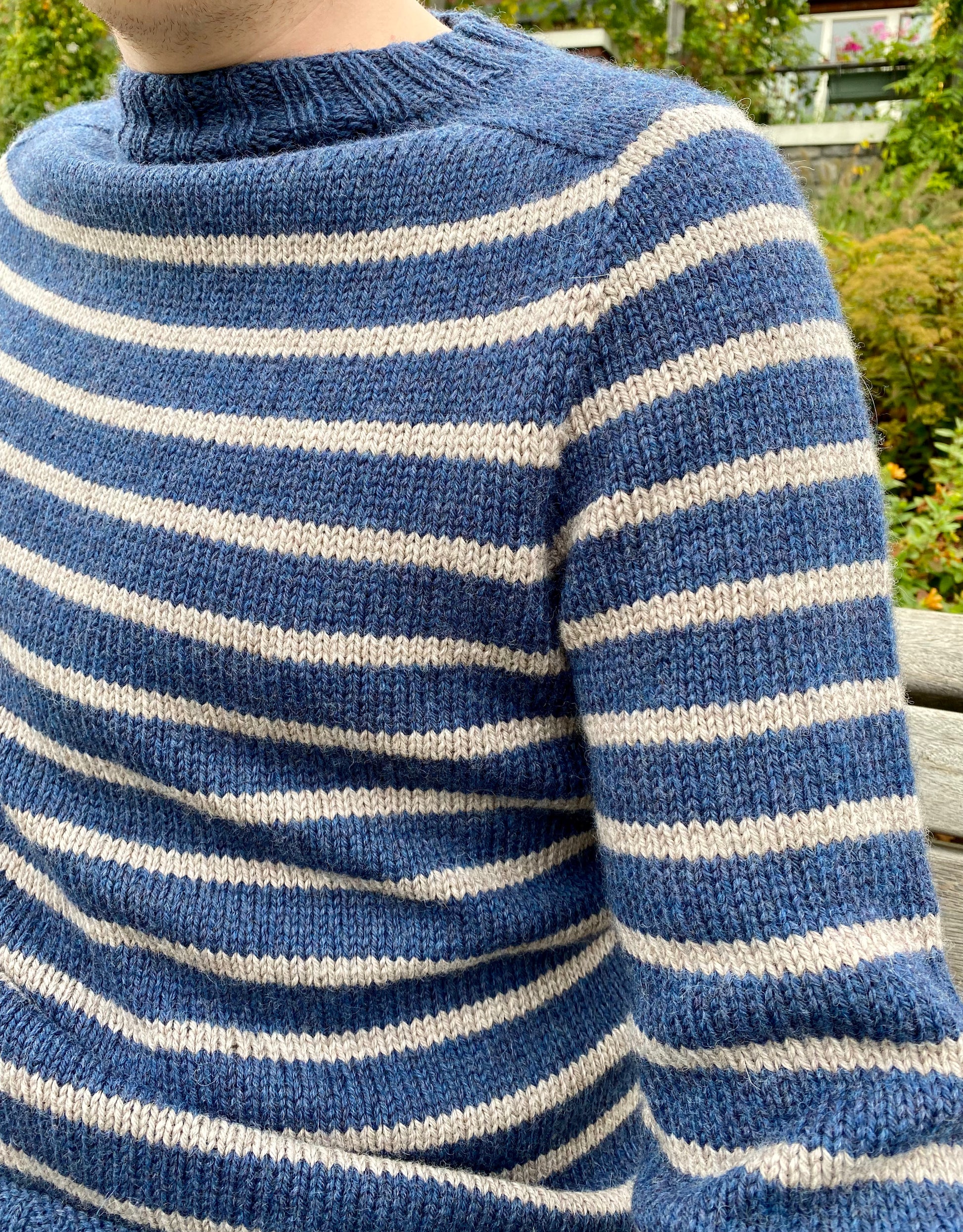 Þessari peysu fylgir smá saga. Þannig er að ég prjónaði þrjár röndóttar peysur á systurbörn mín veturinn 2020 – 2021 og fékk svo falleg skilaboð frá syni mínum í kjölfarið þegar ég póstaði mynd af þeim á Instagram, hvað þetta séu flottar peysur og hvort ég gæti kannski prjónað svona á hann. Ég hélt það nú og úr varð þessi peysa sem ég kalla Spaðann. Spaðinn er herrapeysa með röndum, prjónuð í hring ofan frá og niður. Hún er með svokölluðu axlarsæti og útaukningar í takt við það. Ég mæli með að lesa uppskriftina yfir í heild sinni áður en þið byrjið, amk hlutann um berustykkið þar sem útaukningarnar eru öðruvísi en oft áður.