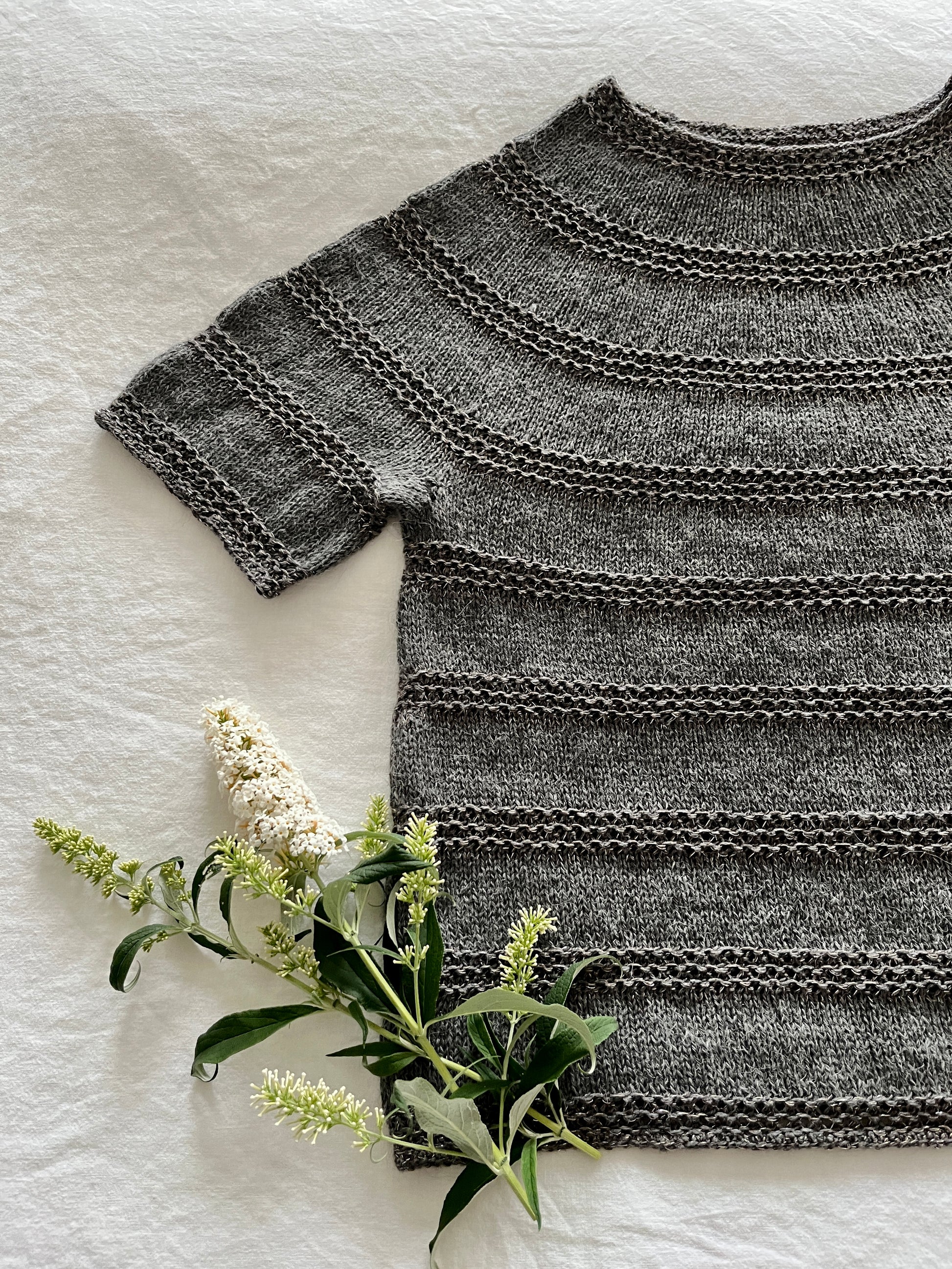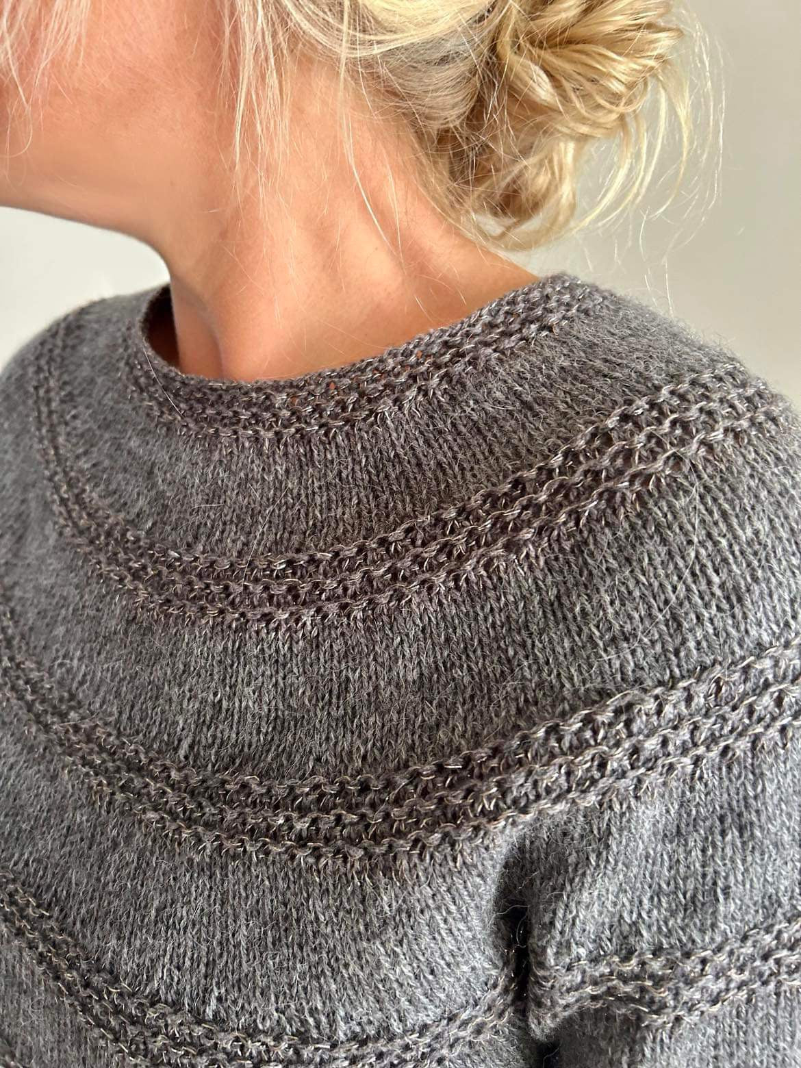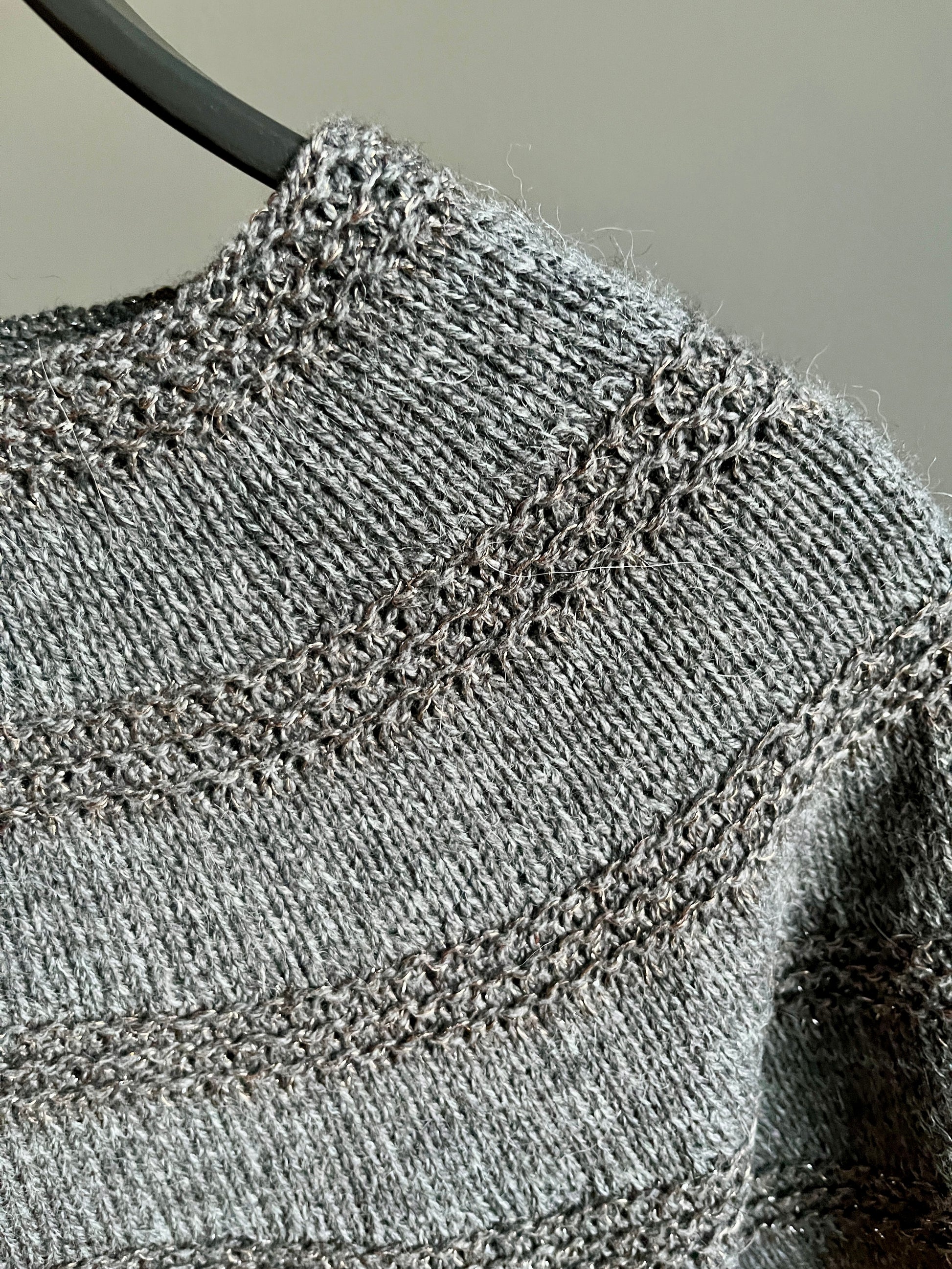 Ég er búin að hugsa um sparilega peysu í þó nokkurn tíma og var alveg með það á heilanum að nota glitþráð, fannst það eitthvað svo hressandi en samt fínlegt. Þessi uppskrift er búin að taka ýmsum breytingum frá upphaflegu formi en þannig bara þróast oft bestu hugmyndirnar. Peysan er prjónuð ofan frá og niður, í hring með þremur þráðum en alltaf bara tveimur í einu. Stuttar ermar og glitþráður í mynsturröndum. Sniðið er frekar þröngt og stutt. Ég mæli með að lesa yfir uppskriftina í heild áður en þú byrjar.