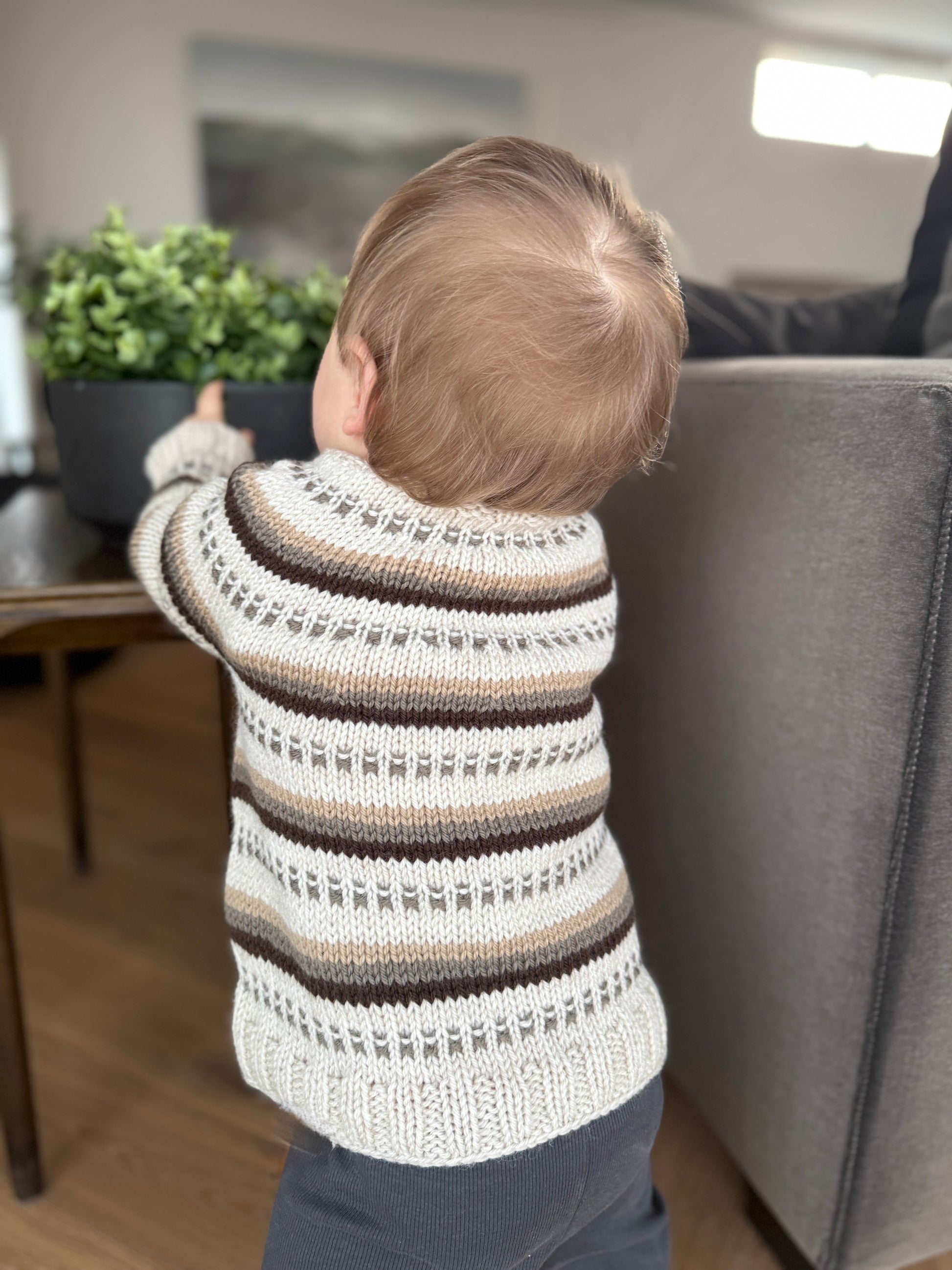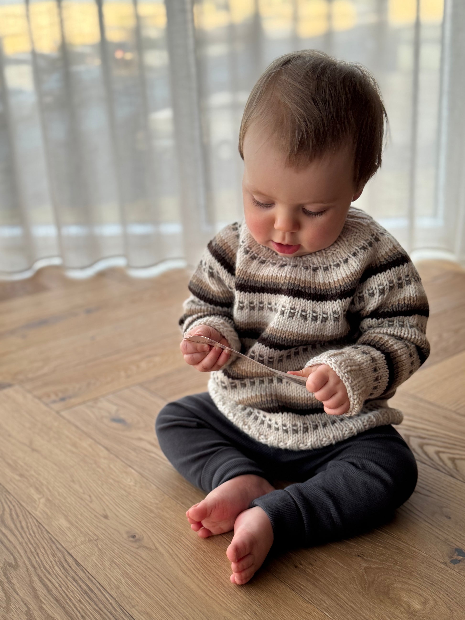 Tindur barnapeysa er í mínum huga skíðaleg – eins og ég hugsa um gamlar skíðapeysur frá því á 7. og 8. áratug síðustu aldar með nútímalegu ívafi. Hlý og kósý fyrir útivistina og notaleg í kakóið eftir útiveruna. Peysan er prjónuð ofan frá og niður, með hringútaukningum á berustykki. Skemmtilegt mynstur þar sem notaðir eru 3 mynsturlitir auk aðallits. Ég sé fyrir mér að það sé hægt að nota allt frá þremur litatónum í gulum, grænum, bláum eða rauðum nú eða brúnum tónum eins og á myndinni eða bara hreinlega alla litríku afgangana sem leynast í skúffunni. Ég mæli með að lesa yfir uppskriftina í heild áður en þú byrjar.