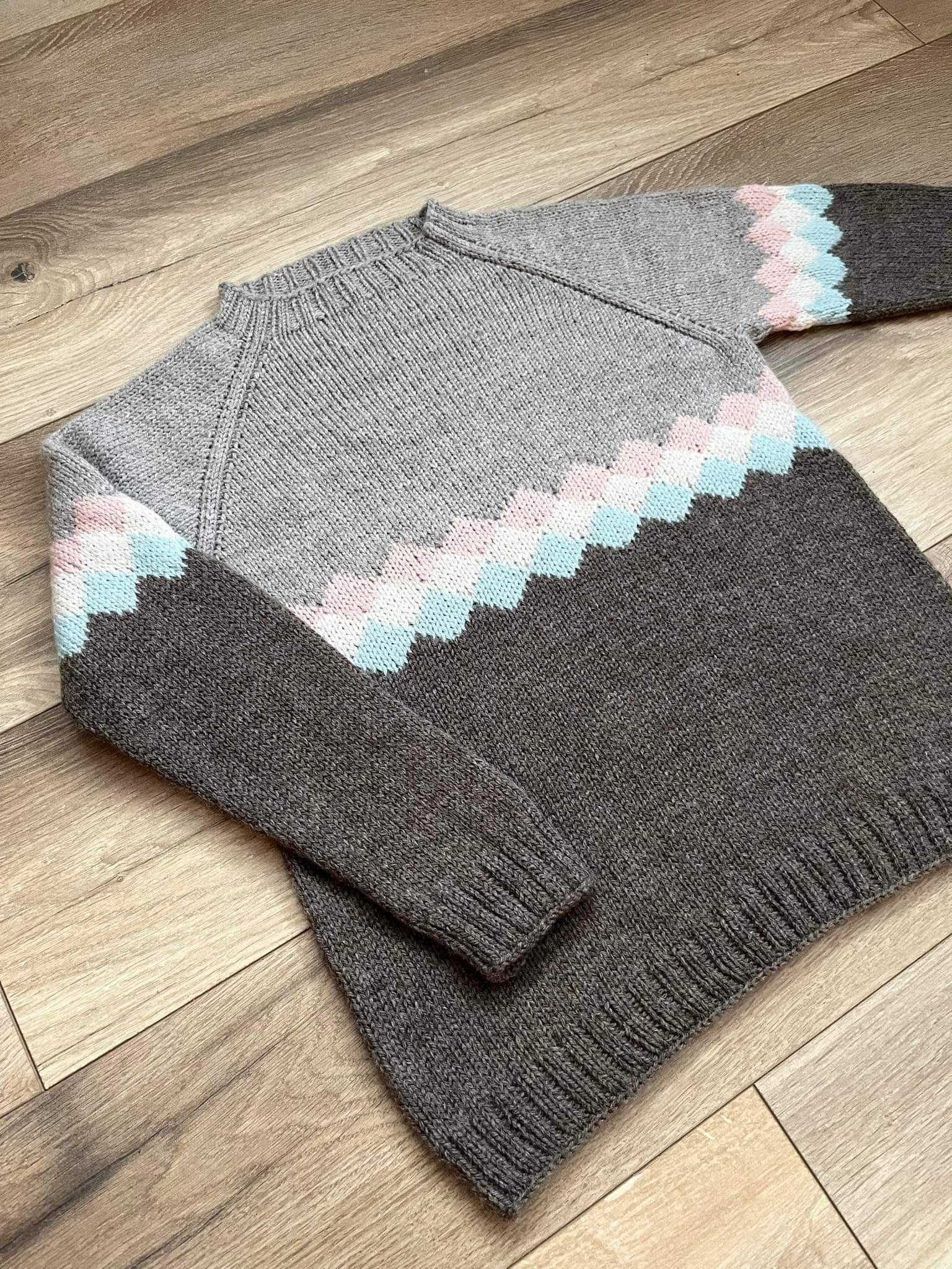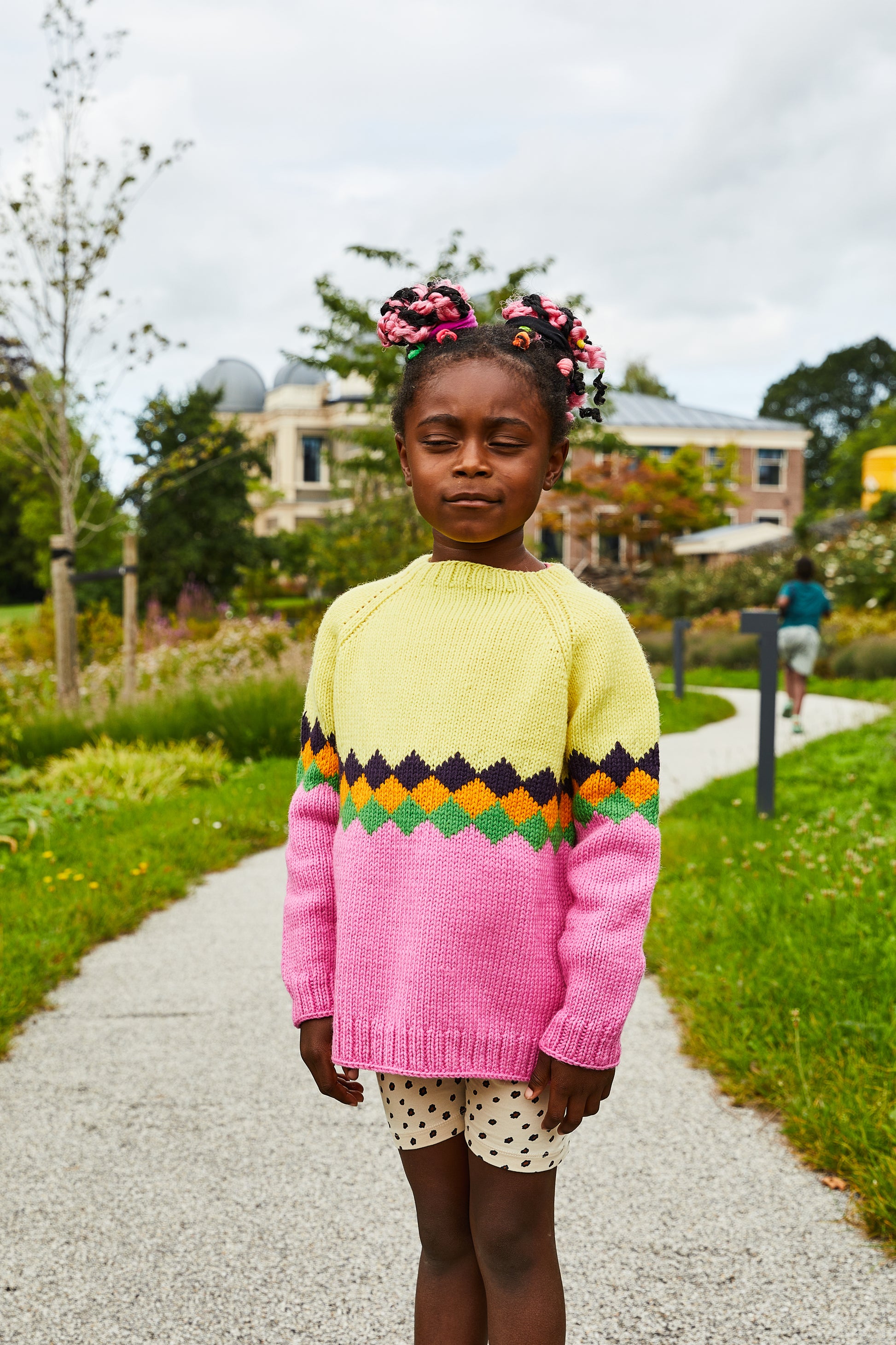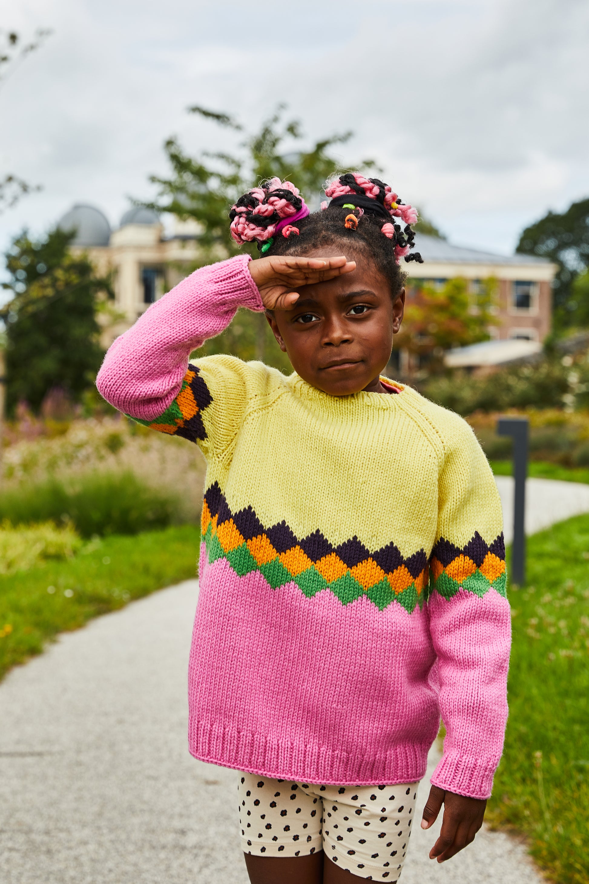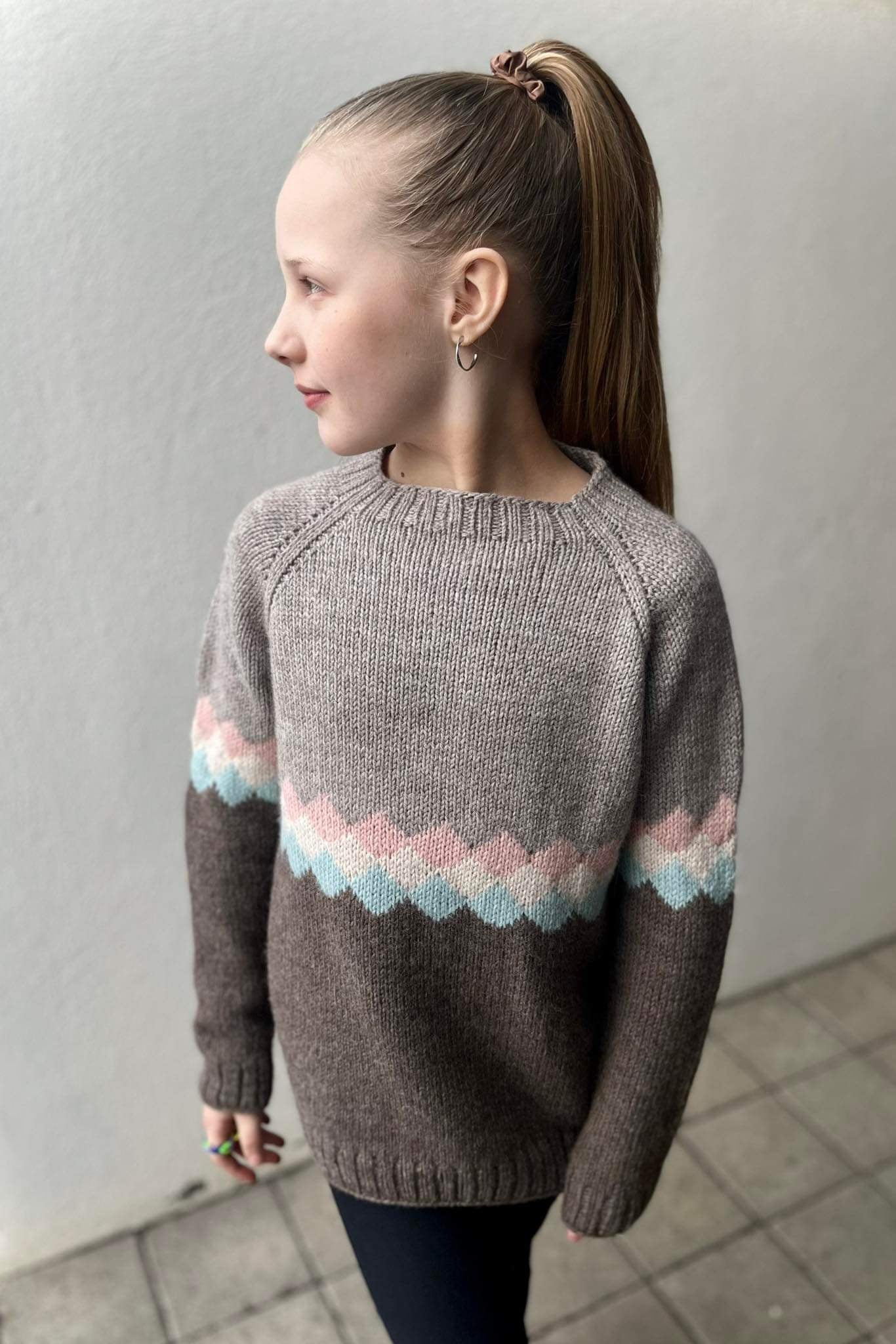 Tívolí barnapeysan er hressileg, litrík og fjörug alveg eins og tívolí. Prjónuð ofan frá og niður, í hring með laskaútaukningum. Skemmtilegt tíglamynstur á bol og ermum skiptir peysunni í tvennt sem gefur henni karakter og mikla möguleika á að leika sér með litina. Fullkomin peysa á alla krakka. Ég mæli með að lesa yfir uppskriftina í heild áður en þú byrjar.